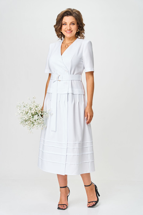 Платье женское полуприлегающего силуэта, с имитацией жакета, с двубортной застежкой на петли-пуговицы. По переду «V-образный» вырез и рельефные линии от плеча. Спинка с двумя рельефами, рядом настрачиваются шлевки, шлевки так же в боковых швах. Юбка в платье с вертикальными защипами сверху и горизонтальными по всей ширине низа платья. Рукав втачной, короткий. К платью прилагается пояс из основной ткани, с полукольцами на конце.