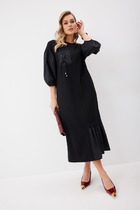 Платье женское полуприлегающего силуэта, втачного покроя рукава. Выполнено из трикотажного полотна с принтом по низу изделия и низу рукава. Горловина округлой формы. По переду по центру расположена имитация застежки на цельнокроеную планку, на петли-пуговицы, переходящая в шлицу. На лицевой стороне платья расположены нагрудные вытачки, идущие из боковых швов. Горловина округлой формы. Спинка цельная, с талиевыми вытачками. Рукав длинный, одношовный.
