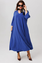 Элегантное платье полуприлегающего силуэта из трикотажного полотна синего цвета. Круглый вырез обработан кантом. Отрезная кокетка и втачные рукава выполнена из декоративного полотна с крупной перфорацией. Аксессуары в комплект не входят.