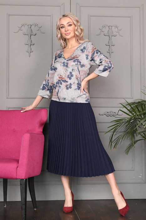 "Женственное платье полуприлегающего силуэта из комбинированного полотна. Верх изделия выполнен из трикотажного полотна серого цвета. V-образный вырез изделия обработан внутренней обтачкой. Платье с втачными рукавами. Верхняя часть изделия дополнена манжетом. Юбка выполнена из гофрированного текстильного полотна. Нижний край юбки обработан швом закрутка.