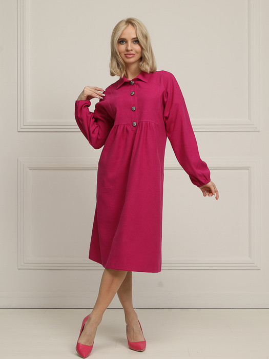 ШтрихКод: 4620306107997 По размеру: 46, 48, 50, 52, 54, 56 Состав: Вискоза 65% Полиэстер 30% Эластан 5% Срок готовности: 2024-11-13T00-00-00Очаровательное платье полуприлегающего силуэта из текстильной ткани цвета фуксии. Платье с отложным воротником, по переду выполнена планка с застежкой на пуговицы. Линия груди эффектно подчеркнута сборкой. Платье со спущенной проймой, втачные рукава обработаны внутренним швом с резинкой. По переду изделия - внутренние карманы. Длина изделия от плечевого шва по спинке до низа изделия - 104 см. Рост фотомодели - 170 см.