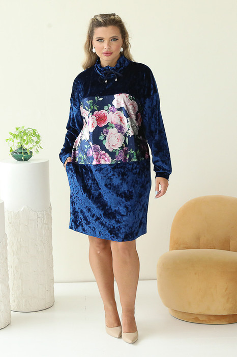 Стильное платье свободного силуэта из трикотажного бархатного полотна синего цвета. Круглый вырез горловины обработан воротником стойка с кулиской. Платье со спущенной проймой и втачными рукавами. Перед изделия дополнен вставкой из полотна компаньона с цветочным принтом.