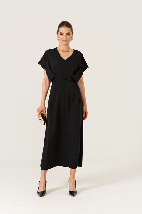 Платье женское из струящейся ткани для повседневной и торжественной носки. Платье полуприлегающего силуэта. платье отрезное по линии талии. Лиф переда имеет средний шов и складки. Лиф спинки имеет складки и средний шов с потайной застежкой молнией. Горловина V-образная. Рукава цельнокроеные, короткие. Юбка платья, расширенная к низу. Переднее полотнище юбки имеет складки. Заднее полотнище юбки со средним швом и вытачками. Платье длиной макси. Платье на вискозной подкладке. Данная модель платья в классическом чёрном цвете покорит вас своей красотой и великолепной посадкой. В данном платье вы будете выглядеть неотразимо и будете ловить на себе восхищенные взгляды.