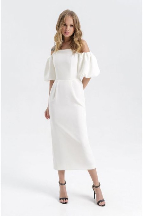 Корсетное платье длины миди из текстильной ткани. Детали: прилегающий силуэт, перед и спинка с рельефными швами, рукава короткие пышные с резинкой, застежка на потайную молнию в среднем шве спинки, платье на подкладке. Вариант мини представлен под арт. 2252