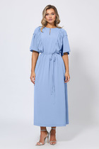 Детали: платье полуприлегающего силуэта, отрезное по талии с напуском, нижняя часть переда с ассиметричными складками, нижняя часть спинки с талиевыми вытачками, верхняя часть платья со складками на талии, рубашечный воротник, застёжка на потайную планку с пуговицами, потайная молния в боковом шве, рубашечный покрой рукава с расширенным плечом, широкие манжеты. Юбка платья на подкладке