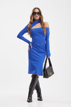 Детали: прилегающий силуэт, фигурный лиф переда, отрезная линия талии, рельефные швы по юбке платья, потайная застежка по спинке, втачные длинные рукава со сборкой по окату, на подкладке.