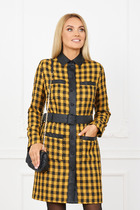 Модель полуприлегающего силуэта, с отрезной линией талии и втачным поясом. На верхней части переда настрочена планка, на нижней - клапаны. Округлый вырез горловины спереди подчёркнут планкой. Средний шов спинки снизу заканчивается разрезом. Платье декорировано пуговицами.