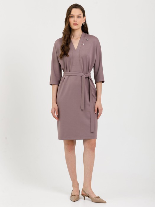 V-образный вырез горловины обработан планкой. Средний шов спинки снизу заканчивается разрезом. Талия подчёркнута съёмным завязывающимся поясом. Платье декорировано брошью.