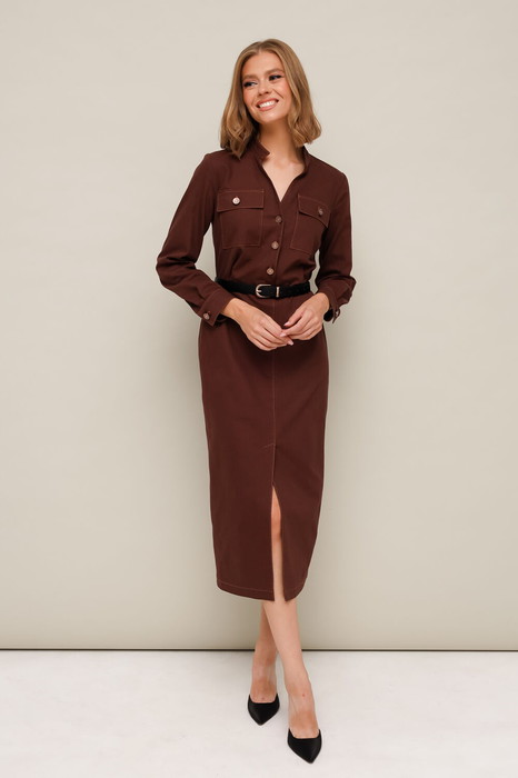 Женское платье полуприлегающего силуэта, отрезное по линии талии, выполнено из джинсовой ткани. Vобразный вырез горловины с притачным воротником-стойкой. Лиф с центральной застежкой на петли, пуговицы и с накладными карманами с клапанами. Юбка с разрезом в среднем шве, который обеспечивает свободу движения. Рукава втачные с притачной манжетой с застежкой на пуговицы. Спинка с талиевыми вытачками. В комплекте прилагается ремень