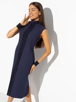 Лиф прилегающего силуэта, выполнен из трикотажного полотна. Горловина с притачным воротником-стойкой. Застежка центральная на тесьму-молнию с притачными планками до линии груди. Рукава втачные длинные. Для комфорта и регуляции размера по талии обработана резинка. Юбка А-силуэта с боковыми наклонными карманами, выполнена из матовой тафты. В комплекте прилагается съемный ремень.