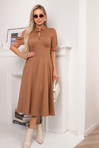 Стильное платье прилегающего силуэта, отрезное по линии талии, выполнено из экокожи и трикотажного полотна. Горловина округлой формы. Длинные втачные рукава. Юбка спереди с подрезом на металлическую молнию, с возможностью регулировать высоту разреза. Застёжка по спинке в среднем шве на потайную молнию.