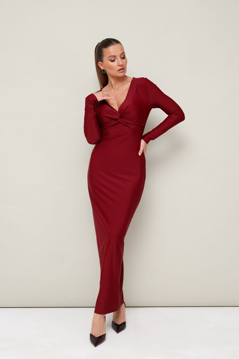 Платье прилегающего силуэта в длине миди. Горловина округлой формы с вырезом «капля». На лифе обработан декоративный узел с подрезом под линией груди. Рукава длинные втачные.