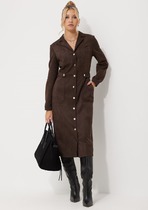 Стильное платье отрезное по линии талии в длине миди, выполнено из экокожи. Округлый вырез горловины. По плечевым швам лифа и по талии обработаны защипы. Юбка со средним швом, переходящим в разрез. Спинка в V-образным вырезом. В среднем шве застёжка на потайную тесьму молнию. В комплекте прилагается пояс из основной ткани с обтяжной пряжкой.