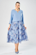 Платье полуприлегающего силуэта, отрезное по талии, выполнено из струящейся ткани с матовым блеском. V-образный вырез горловины. Спереди лифа обработан декоративный узел. Рукава короткие цельнокроеные. Спинка лифа со средним швом, по линии талии для комфорта обработана резинка. Крой юбки по косой.