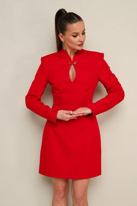 Платье в длине мини, отрезное по линии талии, выполнено из плательной ткани. Горловина с цельнокроеной стойкой и вырезом «капля» с декоративной брошью в виде английской булавки. Лиф переда с рельефами. Длинные друхшовные рукава. Юбка А-образного силуэта. В среднем шве спинки застежка на потайную молнию.