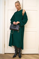 Платье свободного кроя, длиной до середины бедра. На левом переде настрочен накладной карман. Воротник пиджачного типа. Застежка по переду потайная на петли и пуговицы. Рукава одношовные, втачные, длинные. По низу рукава обработан разрез, односторонние складки и притачная манжета, которая застегивается на навесные петли и пуговицы. Платье дополняет съемный пояс с пряжкой.