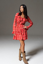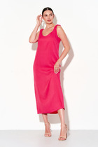 Платье полуприлегающего силуэта, длиной чуть ниже щиколотки. Платье отрезное по линии талии. Лиф спинки с талиевыми вытачками. Юбка спинки с талиевыми вытачками. В среднем шве спинки обработана застежка на потайную тесьму-«молнию». Лиф переда выполнен на запах с мягкими односторонними складками. Юбка переда выполнена на запах. Верхнее переднее полотнище с мягкими односторонними складками. Платье с открытыми плечами. Рукава одношовные, втачные, длиной 3/4. По окату рукава и низу вставлена резинка.