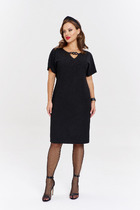 Платье прилегающего силуэта, длиной до середины икры. Платье отрезное по линии талии. Лиф платья выполнен в виде корсета со шнуровкой по спинке. Юбка спинки с талиевыми вытачками и средним швом, в котором обработана застежка на потайную тесьму-«молнию». Юбка переда выполнена на запах с ассиметричным разрезом. Платье с объемным декором в области груди, рук и спинки.