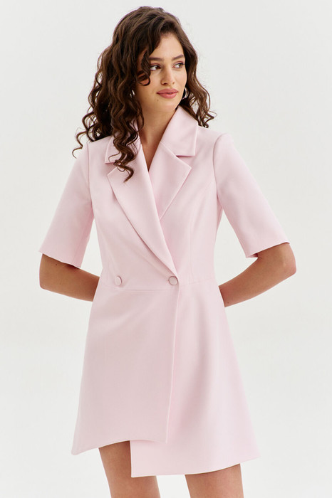 Платье полуприлегающего силуэта, выполненное на запах, длиной до середины бедра. Платье отрезное по линии талии. Лиф спинки со средним швом и рельефами. Лиф переда с рельефами от пройм до подреза по талии. Юбка спинки со средним швом и талиевыми вытачками. Юбка переда ассиметричная: правый перед укорочен, левый перед удлинен. Воротник пиджачного типа. Рукава двушовные, втачные, длиной до локтя. Застежка по переду на петли и пуговицы. Платье на подкладке с плечевыми накладками.