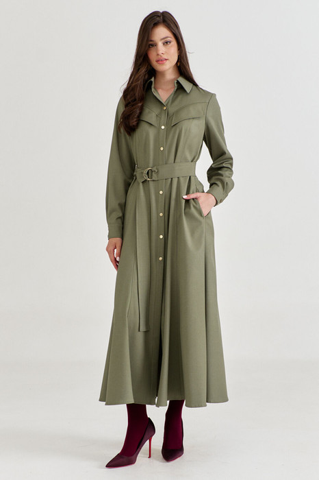 Платье свободного кроя, длиной до щиколотки, расширенное к низу. По спинке кокетка и рельефы. От кокетки по спинке заложена бантовая складка по центру. По переду кокетка и рельефы. В шов притачивания кокетки вставлены клапана. В боковых швах обработаны карманы. Рукава одношовные, втачные, длинные. По низу рукава обработаны складки, разрез и притачная манжета. По манжете застежка на кнопки. По переду застежка на кнопки на притачной планке. По горловине воротник рубашечного типа на отрезной стойке. Платье дополняет съемный пояс.
