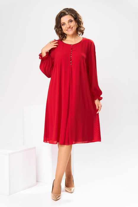 Платье женское расширенное к низу, длиной за колено. Перед с двумя нагрудными вытачками, с разрезом по центру, фиксирующимся на 10 навесных петель и 10 пришивных пуговиц с одной бантовой складкой, выходящей из-под разреза. Спинка цельнокроеная. Горловина круглая, обтачная, без воротника. Рукав полуреглан, втачной, длинный, одношовный, низ рукава собран на эластичную тесьму. Платье на подкладке. Длина спинки 107 см. Длина рукава от горловины 67 см