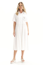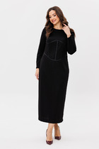 Платье женское для повседневной носки. Платье женское полу прилегающего силуэта, длиной за колено. Перед с 2-мянагрудными выточками, с 2-мя накладными прямоугольными карманами, на уровне линии бёдер, с приточной вертикальной планкой из отделочной ткани. Спинка со средним швом, заканчивающимся разрезом. Застёжка на потайную тесьму-молнию в среднем шве спинки. Горловина с цельнокроеной стойкой, обточная. Платье со спущенным плечом. Рукав втачной, длиной 7/8 с приточной манжетой из отделочной ткани и приточной вертикальной планкой из отделочной ткани по центру. Платье без плечевых накладок. Длина спинки 107 см, длина рукава от горловины 61 см.