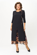 Платье женское для повседневной носки. Платье женское прямого силуэта, длиной за колено, с фигурным низом "ступенька". Перед с двумя нагрудными вытачками. Спинка цельнокроеная. Боковые швы с фигурными разрезами. Разрезы и низ платья с приточными планками из отделочной ткани. Горловина круглая с втачной стойкой. Платье со спущенным плечом. Рукав втачной, длиной 7/8, с приточной вертикальной планкой из отделочной ткани по центру и приточной манжетой из отделочной ткани. Платье без плечевых накладок. Длина рукава от горловины 60 см, длина спинки 103 см.