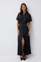 Платье женское, для повседневной носки. Платье слегка расширенное к низу, длиной до нижней части икры. Перед с фигурным подрезом по линии талии и вертикальными приточными планками, верхняя часть с 2-мя нагрудными вытачками; нижняя часть с 4-мя односторонними складками (по 2-е с каждой стороны) зафиксированными отделочными строчками. Спинка отрезная по линии талии. Низ платья с приточным воланом. Горловина круглая обточная, без воротника. Застёжка центральная на 10-ть вертикально обмётанных петель и 10-ть пришивных пуговиц. Рукав втачной, короткий, одношовный с притачным воланом. Платье с плечевыми накладками. Длина спинки 127 см, длина рукава 31 см.