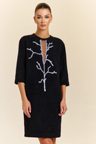 Платье женское предназанеченное для повседневной носки. Платье женское отрезное по линии талии, длиной до нижней части икры. Верхняя часть переда с 2-мя нагрудными вытачками, с 2-мя притачными планками по центру зафиксированы между собой 2-мя пришивными бусинами, нижняя часть переда с лёгкой сборкой по верхнему срезу. Верхняя часть спинки-цельнокроенная, нижняя-цельнокроенная с лёгкой сборкой по верхнему срезу. Низ платья с притачным воланом с лёгкой сборкой по верхнему срезу. Горловина фигурная, обточная, без воротника. Рукав втачной, одношовный, длиной до локтя с приточным воланом по низу с лёгкой сборкой по верхнему срезу. Верхняя часть переда на подкладке. Платье с плечевыми накладками. Длина спинки 126 см, длина рукава 33 см.
