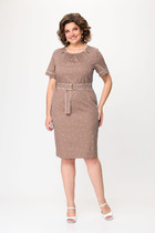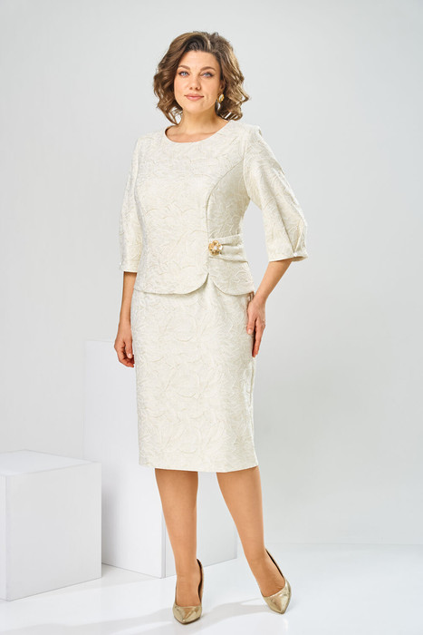 Платье женское, относится к нарядной торжественной одежде. Платье женское  полу прилегающего силуэта, длиной за колено, выполнено в виде имитации костюма. Лиф платья отлетной. Перед с 2-мя отрезными бочками, левый бочок с отделочным фигурным поясом, декорированным объёмным украшением, шов притачивания левого бочка с разрезом с закруглёнными концами. Спинка лифа со средним швом и 2-мя отрезными бочками. Лиф платья на подкладке, к которой крепится нижняя часть платья (юбка). Переднее полотнище нижней части с 2-мя таллиевыми вытачками. Заднее полотнище с 2-мя таллиевыми вытачками и средним швом, заканчивающимся шлицей. Нижняя часть платья на подкладке. Горловина круглая, обтачная, без воротника. Застёжка на потайную тесьму-молнию в среднем шве спинки. Рукав втачной, одно шовный, длиной 3/4. Низ рукава со встречной складкой, обточной, складка декорирована пришивной пуговицей. Платье с плечевыми накладками. Длина спинки 104 см, длина рукава 42 см.