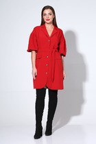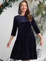 Платье женское, относится к торжественной одежде. Платье женское, отрезное по линии талии, расширенное к низу. Верхняя часть переда с 2-мя отрезными бочками, нижняя без конструктивных особенностей. Верхняя часть спинки со средним швом и 2-мя таллиевыми вытачками, нижняя без конструктивных особенностей. Горловина с V-образным вырезом, с запахом, обтачная без воротника. Застёжка на потайную тесьму-молнию в левом боковом шве платья. Рукав втачной, одно шовный, расширенный к низу, 2-мя односторонними складками по окату, рукав короткий. Платье с плечевыми накладками. К платью прилагается съёмный пояс с застёжкой на пряжку и пробивные блочки.