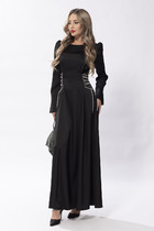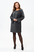 Платье женское отрезное по линии талии, расширенное к низу, длиной до середины икры. Верхняя часть переда с 2-мя нагрудными вытачками, нижняя цельнокроеная. Верхняя часть спинки с 2-мя таллиевыми вытачками, с обтачным разрезом по центру, фиксирующимся по горловине на 1-ну навесную петлю и 1-ну пришивную пуговицу; нижняя часть с 2-мя таллиевыми вытачками. Горловина круглая обточная, без воротника. Застёжка на потайную тесьму-молнию в левом боковом шве платья. Рукав втачной, одно шовный, по окату с лёгкой сборкой, длиной 7/8, низ собран на эластичную тесьму. Платье на подкладке. Платье без плечевых накладок. К платью прилагается отдельный ремень. Длина спинки платья 120 см, длина рукава 56 см.
