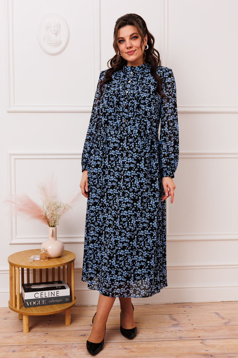 Платье женское, предназначено для повседневной носки. Платье женское отрезное по линии талии, слегка расширенное к низу, длиной до серединны икры. Верхняя часть переда с 2-мя нагрудными вытачками, с 2-мя вертикальными притачными планками, с 7-мью декоративными защипами шириной 0,3 см (с каждой стороны; нижняя часть переда с лёгкой сборкой по верхнему срезу по бокам). Верхняя часть спинки цельнокроеная; нижняя часть спинки с лёгкой сборкой по верхнему срезу. Платье с втачным поясом по линии талии с обработанной по ним кулисой с завязками с металлическими наконечниками. Горловина круглая с втачной стойкой. Застёжка центральная на верхней части переда на 5-ть вертикально обмётанных петель и 5-ть пришивных пуговиц. Рукав втачной, одно шовный длинный со сборкой и притачной манжетой, с застёжкой на обмётанную петлю и пришивную пуговицу. Платье на подкладке. Платье с плечевыми накладками. Длина спинки платья 126 см. Длина рукава 59 см.