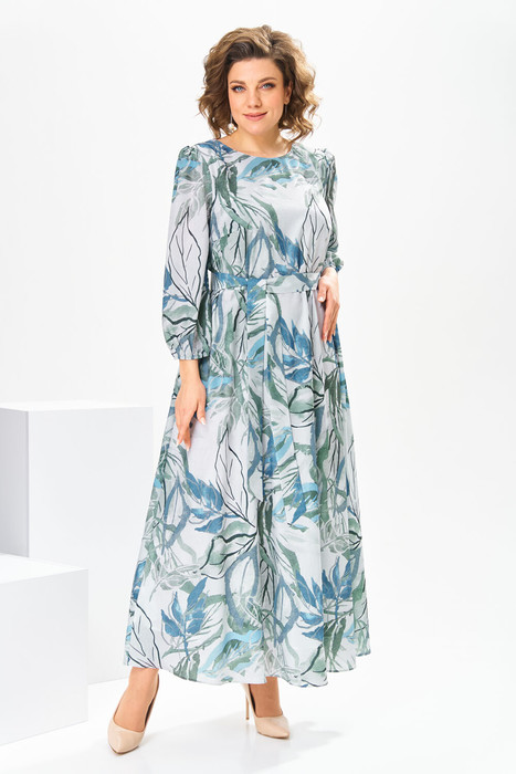 Платье женское относится к нарядной торжественной одежде. Платье женское отрезное по линии талии, расширенное к низу, длинное. Верхняя часть переда с 2-мя нагрудными вытачками, нижняя часть цельнокроеная. Верхняя часть спинки с 2-мя таллиевыми вытачками, с обработанным разрезом по головине, фиксирующимся на 1-ну навесную петлю и 1-ну пришивную пуговицу; нижняя часть спинки цельнокроеная. Горловина круглая, обточная, без воротника. Рукав втачной одно шовный, длинный. Рукав со сборкой по окату. Низ рукава собран на эластичную тесьму. Платье на подкладке. Платье без плечевых накладок. К платью прилагается съёмный пояс. Длина спинки платья 137 см, длина рукава 55 см.