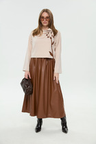 Платье женское относится к нарядной торжественной одежде, но может использовано и при повседневной носке. Платье женское, отрезное по линии талии, расширенное к низу, длиной за колено. Верхняя часть переда с отрезными рельефами, выходящими из плечевых швов, центральная часть с зафиксированным запахом. Верхняя часть спинки со средним швом и 2-мя рельефами, выходящими из плечевых швов. Горловина с V-образным вырезом, фигурная, обточная без воротника. Нижняя часть переда и нижняя часть спинки цельнокроеные, выполнены из отделочной ткани. Шов соединения верхней и нижней частей платья декорирован притачной фигурной отлетной баской. Платье с декоративным поясом из отделочной ткани, закреплённом на левом боковом шве и фиксирующимся в бант через металлическую пробивную блочку на центральной части переда. Рукав одно шовный втачной, длиной до локтя, с притачной фигурной манжетой. Платье с плечевыми накладками. Нижняя часть на подкладке. Длина платья 112 см, длина рукава 33 см.