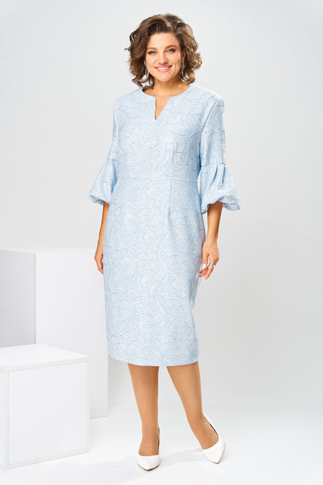 Платье женское, относится к торжественной нарядной одежде. Платье женское, полу прилегающего силуэта, длиной ниже колена. Перед отрезной по линии талии. Верхняя часть переда со средним швом и 2-мя таллиевыми вытачками, нижняя часть с 2-мя таллиевыми вытачками. Спинка с 2-мя таллиевыми вытачками и средним швом, заканчивающимся шлицей. Горловина фигурная, обточная, без воротника. Застёжка на потайную тесьму-молнию в среднем шве спинки. Рукав втачной, одно шовный, длиной 3/4, с горизонтальным разрезом, нижняя часть рукава с 5-ю односторонними складками, со сборкой по низу, низ обточной. Платье на подкладке с плечевыми накладками. Длина спинки платье 111 см, длина рукава 45 см.