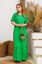 Платье женское предназначено для повседневной носки. Платье женское, прямого силуэта, длиной до нижней части икры. Перед с 2-мя фигурными рельефами, выходящими из плечевых швов, выходящими через центр груди и уходящими в боковые швы. Спинка с декоративной V-образной вставкой, из отделочной ткани, спинка декорирована пришивной металлической пластиной. Горловина круглая с втачным воротником, с разрезом по переду с втачной молнией. В боковых швах обработаны карманы. Низ платья с притачной широкой планкой из отделочной ткани со средним швом по спинке, заканчивающимся разрезом. Рукав цельнокроеный, короткий с притачной манжетой из отделочной ткани. Платье без плечевых накладок. К платье прилагается съёмный пояс. Длина спинки платья 133 см, ширина рукава вверху 21 см.