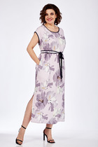 Платье женское, предназначено для повседневной носки. , так же может использоваться как нарядная одежда. Платье женское, длинное, слегка расширенное к низу. Перед с 2-мя отрезными бочками от подреза на уровне линии талии. Спинка отрезная по линии талии. Шов соединения деталей платья платья по линии талии с надстрочной кулисой собранной на эластичную тесьму. Низ платья с 4-мя горизонтальными притачными планками, чередующимися по цвету, на 3-х планках по 4-и односторонних маленьких складки по переду и спинки, формирующими расширение к низу. Низ платья с притачным воланам, с лёгкой сборкой по верхнему срезу. Горловина круглая, без воротника. Рукав цельнокроеный, короткий. Горловина и низ рукава обработаны косой бейкой. Платье со съёмным украшением. Платье без плечевых накладок. Длина спинки платья 138 см, ширина рукава под проймой 23 см.