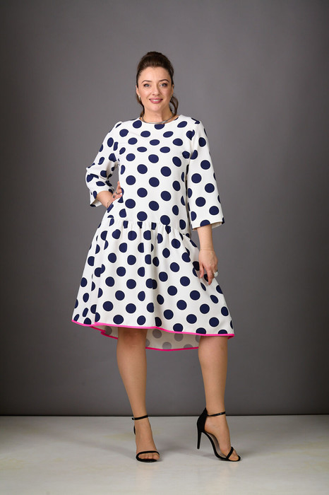 Ах, какая находка - платье  в эффектные горохи! Невероятно красивое, комфортное платье  станет вашим пропуском в лето! Роскошное платье трапециевидного силуэта из плательной ткани. Сочные горохи, разница в длине между передом и спинкой, яркая полоса  по  низу делают платье неповторимым. Нижняя  присборенная  часть платья добавит легкости.  Рукава втачные, трехчетвертные. По спинке - средний шов, молния. Cкрасьте момент с Rosheli!