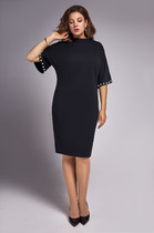 Платье силуэта «летучая мышь» из плательной стрейчевой ткани. Классический черный в сочетании со вставкой из кожи оттенка серебра и цветами ручной работы, украшающими перед платья - все это выглядит роскошно и стильно. Молния в среднем шве спинки. Рукава трехчетвертные. Длина изделия по спинке от точки основания шеи до низа-100 см. рукав - 58 см.