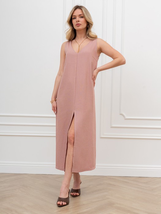Платье женское из гладкокрашеного тканого полотна, свободное, слегка расширенное к низу, с глубоким V-образным вырезом горловины, обработанным внутренней обтачкой, без рукавов, с вытачками в области груди. Перед состоит из двух частей, в шве соединения деталей по центру длинный разрез.