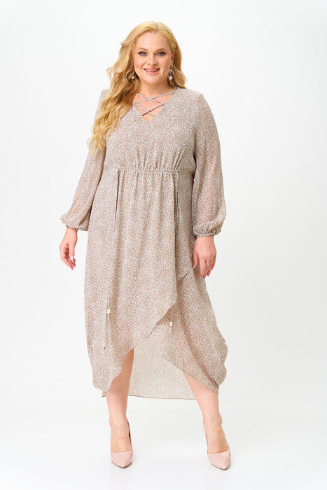 Платье женское из нежного шифона полуприлегающего силуэта, слегка зауженное к низу. Горловина v-образная декорирована косой бейкой. На уровне линии талии по переду регулируемая кулиса. Спинка со швом по линии талии, присборен эластичной тесьмой. Рукав длинный, по низу рукава сборка на эластичную тесьму. Нижний срез переда фигурный.