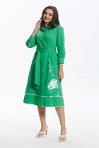 Платье женское свободного силуэта, с втачным рукавом. Перед с нагрудными выточками. Спинка с застежкой на молнию в среднем шве. Горловина круглой формы, декорирована отложным воротником. Изюминка платья – волнообразные рукава с разрезом, по низу на притачной манжете, с застежкой на петли и пуговицы.
