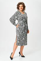 Верхнее платье из шифона свободного кроя расширено к низу, с втачным рукавом. По горловине воротник стойка с застежкой по спинке на две воздушные петли и пуговицы. Рукав длинный расширенный к низу. В боковых швах высокие разрезы.