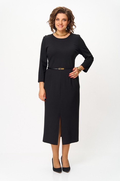Платье женское полуприлегающего силуэта с втачным рукавом. Перед платья с горизонтальным эластичным швом по талии. Верхняя часть с вытачками по линии груди, нижняя часть со складками в области талии и карманами что обеспечивает прекрасную посадку и подчеркивает фигуру. Рукав длиной 7/8. Высокие разрезы по бокам и переду платья добавляют удобства. В комплекте съемный ремень.