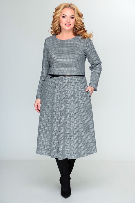 Платье   женское полуприлегающего силуэта.  Выполнено из трикотажного полотна. Платье отрезное по линии талии. По лифу переда расположены рельефы, по лифу спинки – талиевые вытачки. Нижняя часть  платья А-силуэта.   Спинка лифа платья со средним швом, в который вставлена потайная молния.  Юбка платья переда и спинки цельнокроеные, выполнены по косой. В боковых швах юбки расположены карманы.  Рукав втачной  одношовный, длинный.  В комплект входит  ремень.