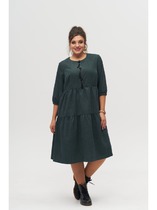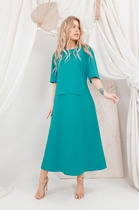 Платье из шифона на трикотажной подкладке. Лиф отрезной по линии и на резинке, низ расклешенный. Подкладка верхней части платья на бретелях. Рукав длинный втачной. По низу рукава сборка и притачная манжета, застёгивающаяся на 2 петли и пуговицы. Горловина округлой формы, по центру переда капелька с завязкой. В комплекте ремень.
