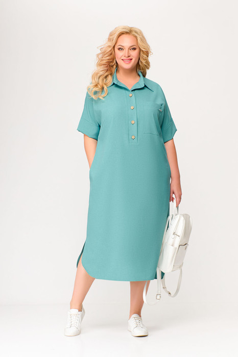 Платье женское прямого силуэта. Выполнено из вискозно-льняной ткани. Перед и спинка платья цельнокроеные. Рукав платья спущенный с притачной манжетой, которой можно регулировать длину рукава. Перед платья с нагрудными вытачками и центральной застежкой на планку, которая застёгивается на 4 петли и 4 деревянные пуговицы. Воротник рубашечного типа, стояче-отложной. В области груди расположен накладной карман с фирменной нашивкой-логотипом. В боковых швах обработаны карманы, по низу боковых швов - разрезы.