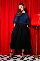 Платье из мягкой вискозной ткани (плательный креп турецкого производства) полуприлегающего силуэта. По переду обработаны нагрудные вытачки и планка до линии груди, застёгивающаяся на 4 декоративные металлические кнопки. Воротник рубашечный с отрезной стойкой. Рукав цельнокроеный, короткий, спущенный с отложной манжетой по низу.