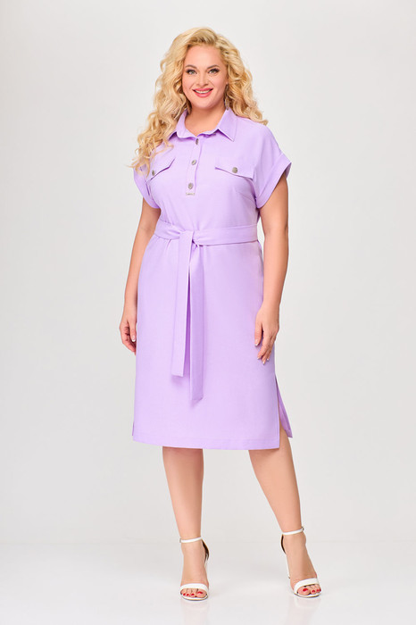 Платье из мягкой вискозно-льняной ткани полуприлегающего силуэта. По переду обработаны нагрудные вытачки и планка до линии груди, застёгивающаяся на 4 петли и 4 декоративные металлические пуговицы. По переду платья расположены два нагрудных клапана с пуговицами. Воротник рубашечный с отрезной стойкой. Рукав цельнокроеный, короткий, спущенный с отложной манжетой по низу. В комплекте пояс из основной ткани.